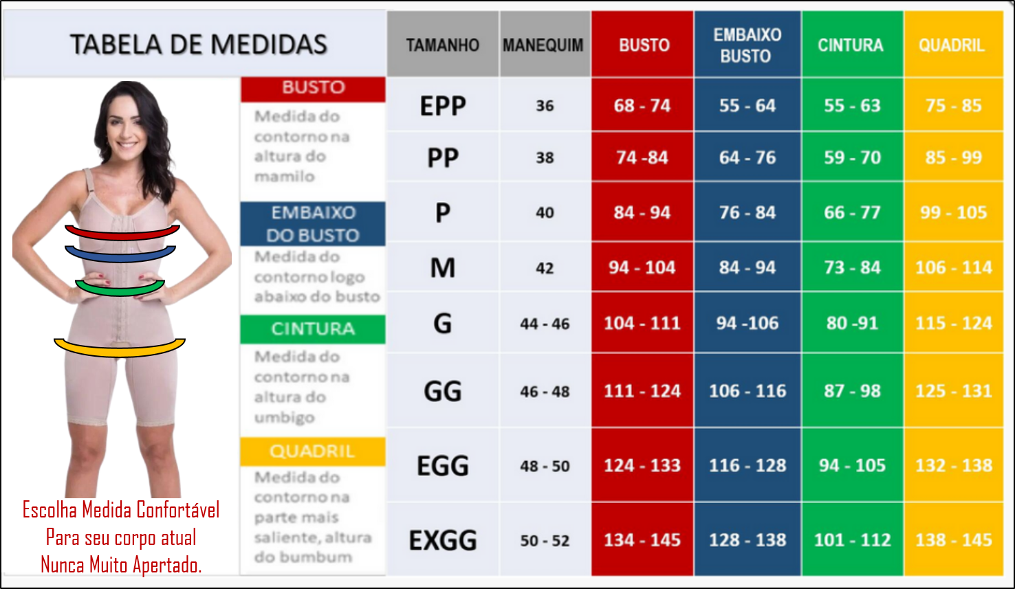 Complementos : Abertura frontal em colchetes; Duas regulagens de tamanhos; Costura rebatida e moldado em tecido fino na região dos seios; Reforço abdominal com tecido duplo em alta compressão,; Alças largas e fixas com melhor sustentação e decote alto nas costas; Pernas com acabamento delicado em renda; Fundo com abertura para higienização entrepernas.